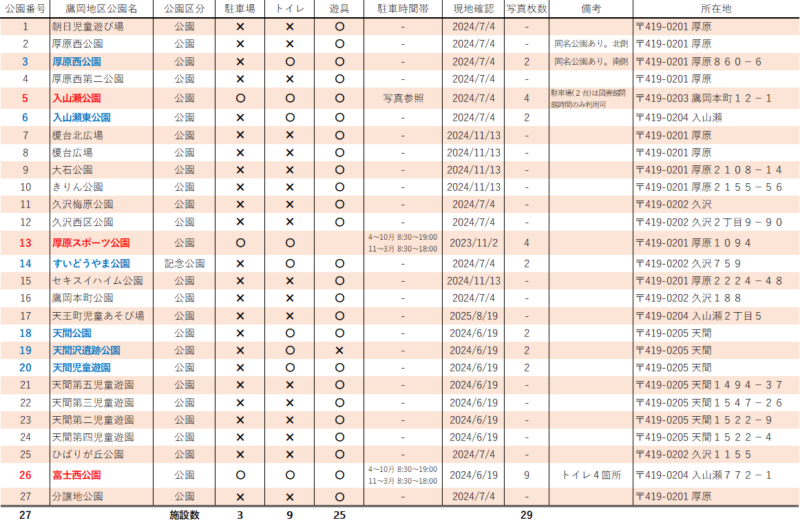 また、駐車場やトイレを設置している公園については、駐車場やトイレの外観などを写真撮影しており、グーグルマップの位置説明欄に『写真あり』と記載してあります。冒頭の表から写真撮影した公園だけを絞り込んで再作成したものが下の表になります。表内の公園番号か公園名のどちらかをクリックすると目的の公園を確認することができます。